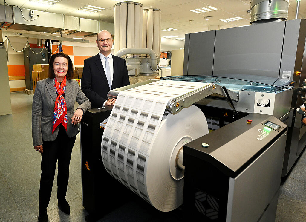 Lotto-Mitarbeiter Deutscher bleibt vor einer großen Rolle weißen Papiers stehen – etwa so groß wie ein Lkw-Reifen. Der Rohstoff für die Lose. Mit hoher Geschwindigkeit rollt sich das Papier ab, läuft durch verschiedene Maschinen und kommt am Ende bunt bedruckt wieder heraus.