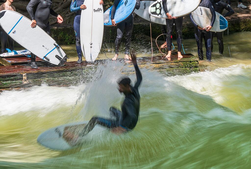 Nach mehrwöchiger Sperrung während der staatsanwaltschaftlichen Ermittlungen gibt Oberbürgermeister Dieter Reiter das Surfen Ende Juni wieder frei. Laut "Süddeutscher Zeitung" wird das jetzt von Sicherheitsleuten überwacht, die auch Unfälle dokumentieren. Mehrfach, so schreibt die Zeitung unter Berufung auf ein für die Stadt erstelltes Dossier, habe der Krankenwagen anrücken müssen; etwa weil sich Surfer am Kopf verletzten.