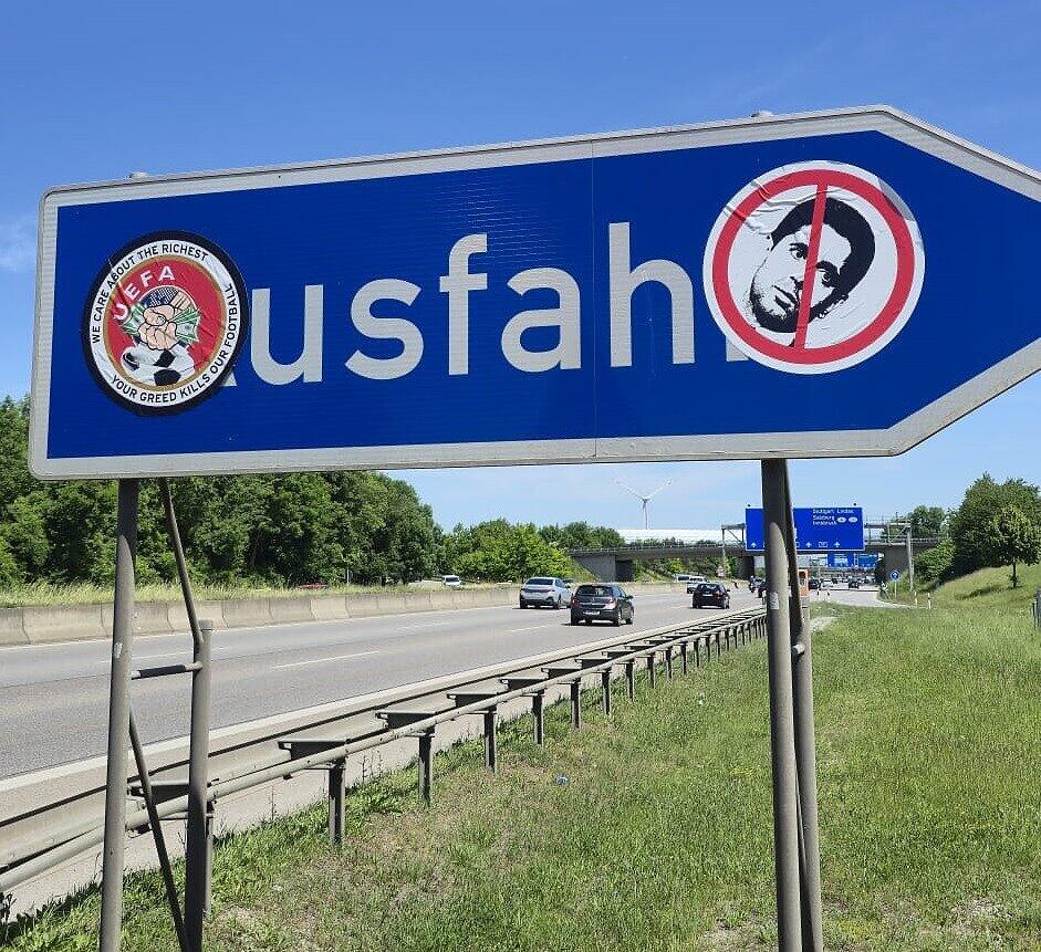 Daniel Wallas, Abteilungsleiter Verkehr und Telematik, schickt der AZ beispielhaft mehrere Bilder von beklebten Schildern aus der Zeit rund um das Champions-League-Finale in diesem Jahr. Ein riesiger Sticker verdeckt zum Beispiel das weiße Autobahn-Symbol und gleich noch den Anfang von "Salzburg". Auf einem anderen Bild ist zu sehen, wie zwei Sticker das Wort "Ausfahrt" verunstalten und auf "usfah" zusammenschrumpfen lassen.