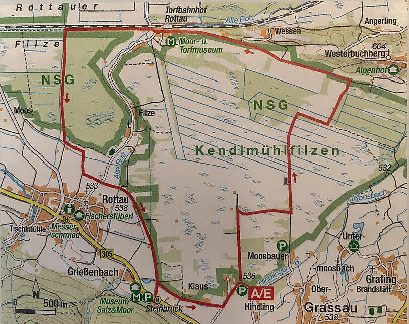 Am Abzweig zu den Kneippbädern geht es links am Waldrand entlang, dann rechts auf eine Wiese. Von jetzt an weist der Hochgern die Richtung, bis es rechts zum Moorerlebnisweg geht. Vorbei am Spielplatz bietet sich ein Abstecher zum Museum Salz und Moor an, oder man biegt rechts in den Wald und gelangt nach 1,5 Kilometern zum Ausgangspunkt.