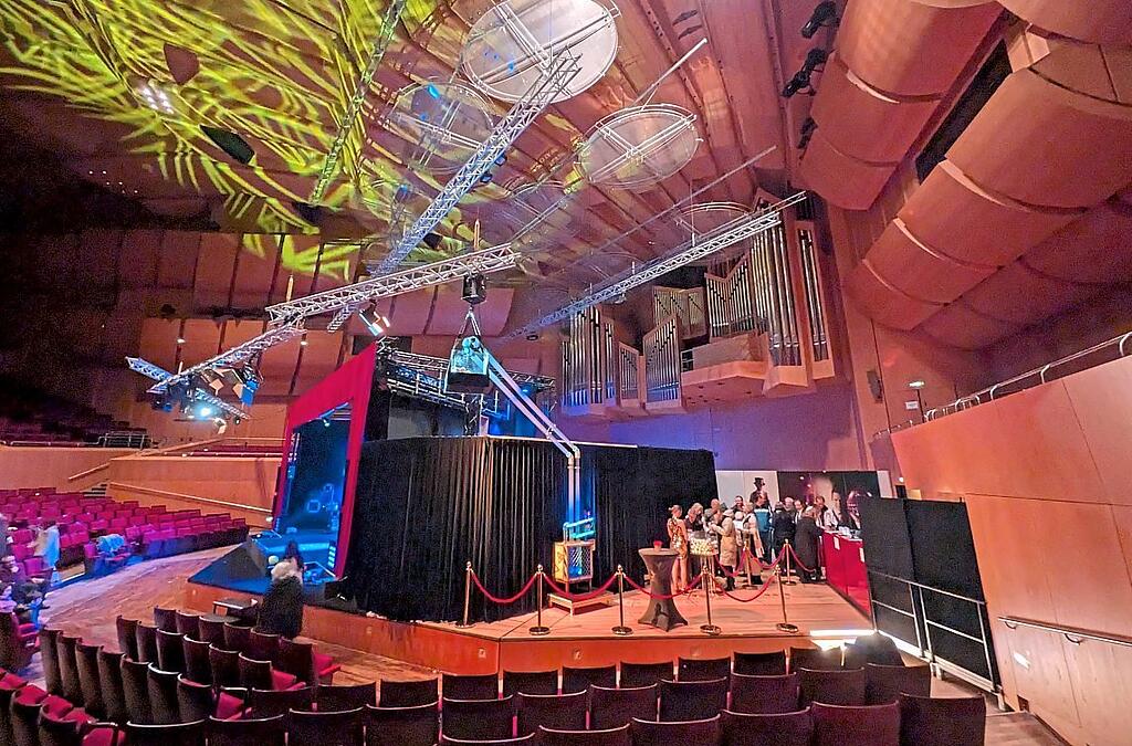 Dann darf man in einem engen Gang noch nachlesen, wie man als Musiker mit dem Stuhl und dem Instrument korrekt zu einer Einheit verschmilzt - und steht auf dem Podium der Philharmonie, wo sich nun eine Bar befindet und charmante Assistentinnen das Publikum auffordern, einen mit finanziellen Mitteln erfüllbaren Herzenswunsch aufzuschreiben, der anschließend mit Druckluft über eine Kugelbahn in einen Korb befördert wird.