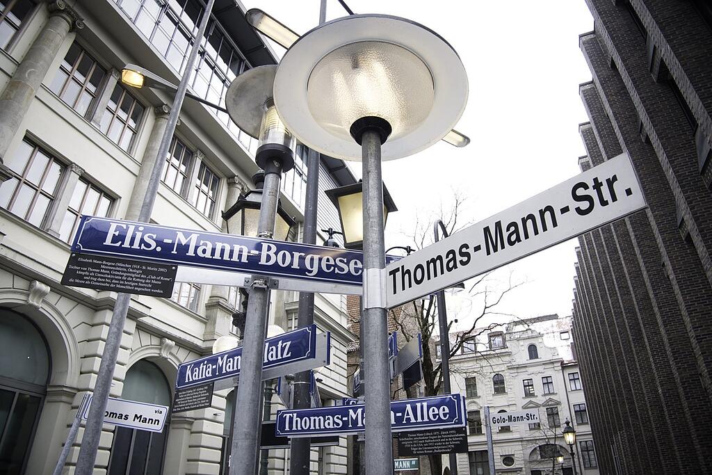 Die Denkmalbranche darf da nicht untätig bleiben. Daher verschönert seit Anfang Dezember die Installation "Straßen Namen Leuchten" von Albert Coers den öden Platz zwischen dem Literaturhaus und der Salvatorgarage. Sie besteht aus Straßenschildern aus München, Frankfurt, Zürich, Rom und São Paulo, die nach Mitgliedern der Familie benannt sind. Ergänzt werden sie durch Straßenlampen von Orten, an denen die Manns lebten oder im Exil waren: Lübeck, Nida, Sanary-sur-Mer, New York, Los Angeles oder Kilchberg.