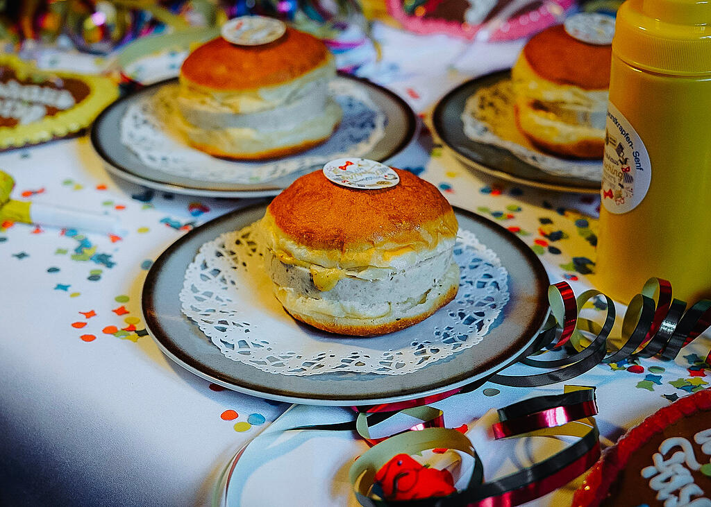 "Aber nicht nur die Wurst ist hervorragend, auch der Krapfen kann was", betont Katharina Kreutzkamm-Aumüller. Ein ganz normaler Kreutzkamm-Krapfen, der ohnehin mit wenig Zucker auskommt. Bei den süßen Krapfen komme die Süße über die Füllung. Der Senf ist eine Mischung aus süßem und scharfem Löwensenf.
