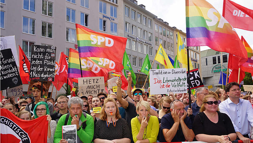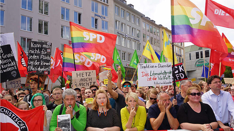 Rund 100 Zuhörer waren auf Seiten der AfD gekommen - und mehrere tausend Gegendemonstranten, die die Redner der AfD ausbuhten und mit Trillerpfeifen übertönten. Immer wieder war vor allem während der Rede von Beatrix von Storch "Nazis raus", "Niemand braucht die AfD" und "Hau ab" zu hören.