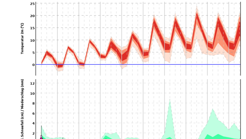 Während wir es am Dienstag noch mit einzelnen Schnee- oder Schneeregenschauern zu tun bekommen und immerhin auch längere trockene Phasen erleben dürfen, kündigen sich nach einer kalten Nacht am Mittwoch dann immerhin schon Temperaturen zwischen 7 und 12 Grad an.