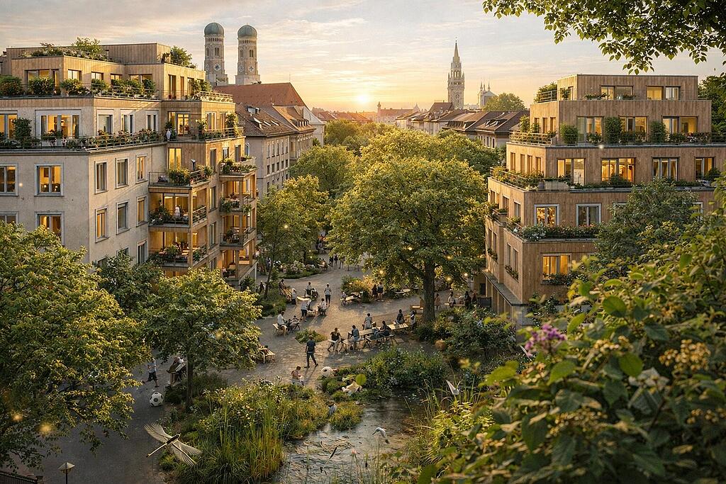 Im Hintergrund sieht man die Frauenkirche und das Münchner Rathaus. Davor stehen Wohnhäuser mit Holzfassaden, mit begrünten Balkonen. Auf den Straßen wachsen Bäume. Menschen sitzen oder spazieren auf der Straße. Autos gibt es keine. Dafür ist da ein Weiher. So sieht das Bild von München aus, das Sabine Krieger, die stellvertretende Vorsitzende des Bund Naturschutz, von einer KI hat erstellen lassen und das an diesem Dienstagvormittag auf einer Dachterrasse im Werksviertel aufgestellt ist.