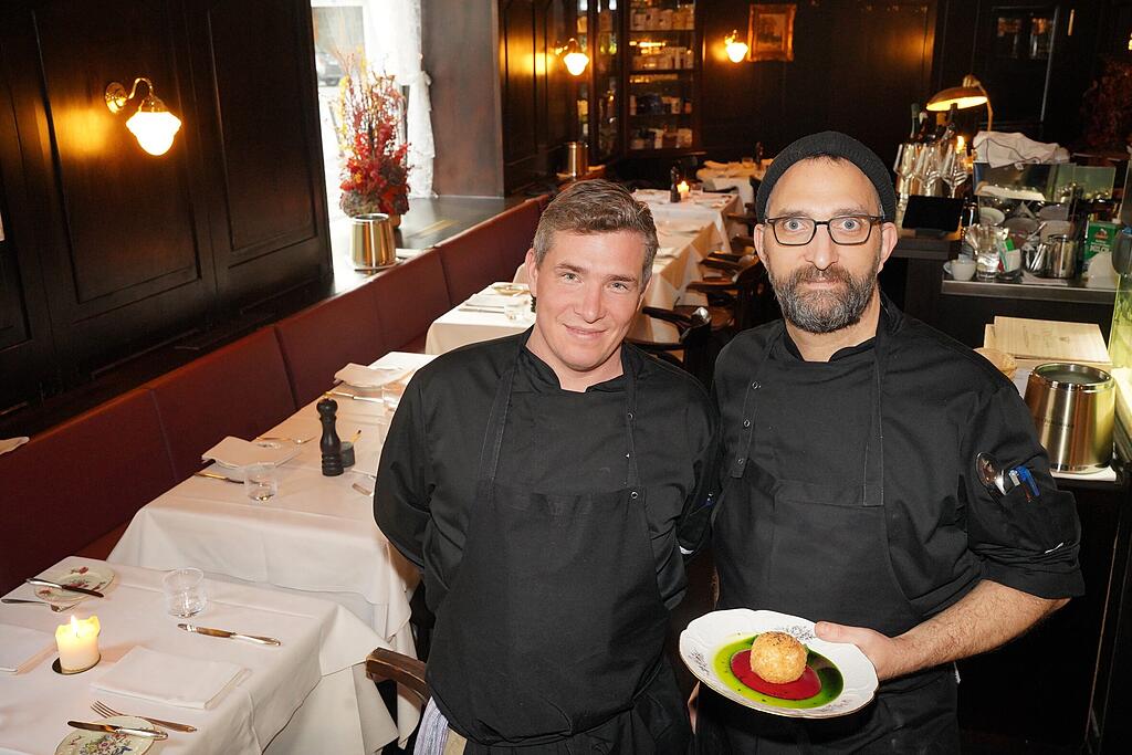 Vegetarier wählen die knusprig gebackene Burrata auf Roter Bete Püree und Basilikumöl (18 Euro). Als Hauptgang gibt es das besagte Wiener Schnitzel (34,50 Euro). Aber die beiden Köche toben sich hier noch viel kreativer aus. Vom Saibling mit Kartoffelcrumble (29 Euro) bis über Coq au vin blanc (29 Euro) bis hin zum vegetarischen Steinpilzstrudel (28 Euro).