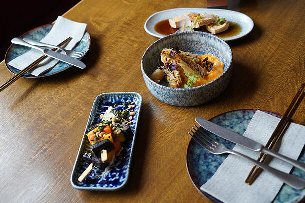 Die besonderen Details fangen bei den Zutaten an. Das Fleisch kommt von einem bayerischen Züchter, der Wagyu-Rind mit deutschem Fleckvieh kreuzt. Fisch, Miso und Tofu sind ebenfalls aus Deutschland. Die Rezepte haben auch vietnamesische und koreanische Einflüsse.