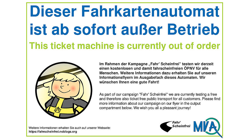 "Im Rahmen der Kampagne "Fahr' Scheinfrei" testen wir derzeit einen kostenlosen und damit fahrscheinfreien ÖPNV (Öffentlicher Personennahverkehr, d. Red) für alle Menschen", stand auf einem Zettel, der über die Anzeige des Automaten geklebt wurde. Was scheinbar als neues Angebot der Münchner Verkehrsgesellschaft (MVG) deklariert wurde, stellte sich in Wahrheit jedoch als eine irre Boykott-Aktion der Macher der Ticket-Gegner heraus.