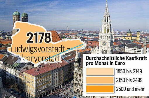 Die Kluft in München ist groß. Die Menschen im wohlhabendsten Bezirk können im Jahr fast 11000 Euro mehr für den Konsum, ihre Miete oder andere Lebenshaltungskosten ausgeben als die im finanzschwächsten Teil der Stadt. An der Spitze der Skala stehen, wie wohl nicht anders zu erwarten: Altstadt und Lehel. Dort liegt die Kaufkraft der Bewohner im Schnitt bei 2766 Euro im Monat.