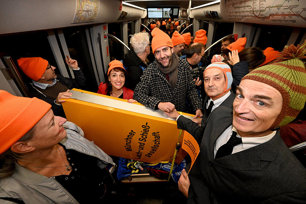 Das Schild der Lach- und Schießgesellschaft wird von Mitgliedern der Münchner Lach- und Schießgesellschaft auf einem Leiterwagen in der S-Bahn Station Marienplatz in eine S-Bahn geladen. © picture alliance/dpa