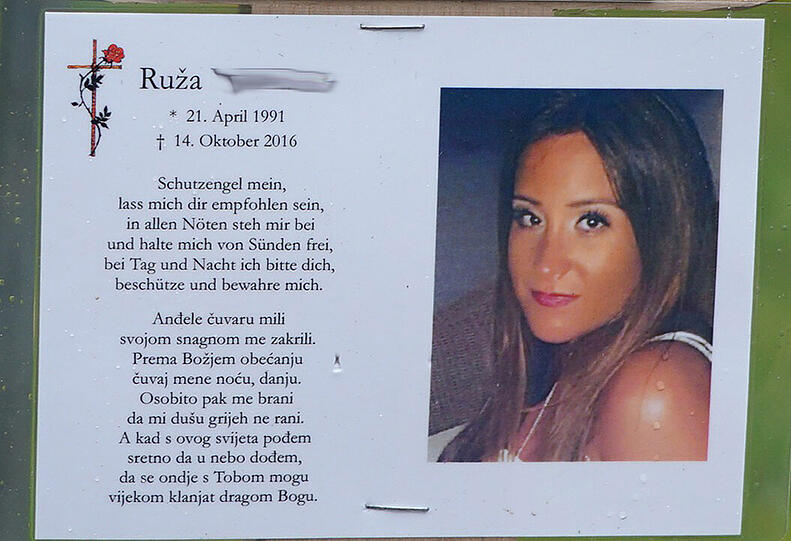 Mit einem Kranz voller dunkelroten Rosen verabschiedete sich Ruza V.s Freund von seiner großen Liebe. Ihre Familie schrieb ihr die Worte: „Wir sehen uns im Himmel wieder“ auf einen Rosenkranz. Und auf einem Foto ist Ruza als Teenager mit einem kleinen Mädchen zu sehen – wohl ihrer jüngeren Schwester. Die Kinder sitzen auf einem Karussel, die Kleine winkt.