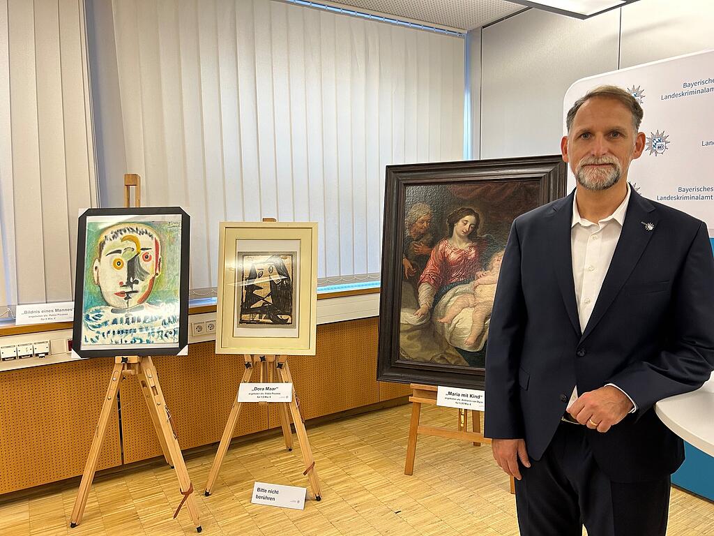 Kunstfahnder Patrick Haggenmüller neben drei der mutmaßlich gefälschten und sichergestellten Werke, v.l.: Bildnis eines Mannes, Dora Maar (beides von Pablo Picasso) sowie "Maria mit Kind“ von Anthonis van Dyck. Zwischen 1,5 und 5,39 Millionen Euro sollten sie kosten.
