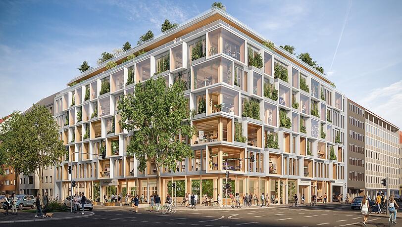 "Grün, nachhaltig, energieeffizient" - so wird es beworben: Das neue Holz-Bürogebäude mit Betonkern, das an dieser Stelle errichtet werden soll. Die hellen Räume hinter der gegliederten und begrünten Fassade sollen einmal bis zu 1.000 Arbeitsplätze bieten.