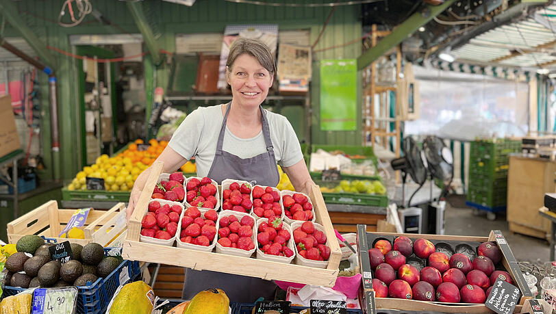 Susi Müller arbeitet beim Obsthof Bucher am Viktualienmarkt. Hier gibt es saisonale Früchte aus Markdorf am Bodensee, im Moment Erdbeeren, Rhabarber und Äpfel. Aber auch Kirschen, Aprikosen, Pfirsiche, Zwetschgen gibt es dort im Sommer. Auch das Gemüse am Stand kommt zum Teil vom Bodensee.