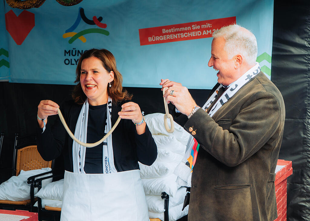 Aus einer Schnapsidee auf der Wiesn ist schließlich die "Gastgeber-Olympiade" am Marienplatz geworden. Gemeinsam mit diversen Wirtschaftsverbänden und dem eigens gegründeten "Bündnis Pro Olympia" traten Wirtinnen und Wirte verschiedener Gaststätten und Hotels dort zwar nicht in olympischen, dafür aber in gastgeberischen Disziplinen gegeneinander an: Maßkrugstemmen, Kissen beziehen und Brezn formen.