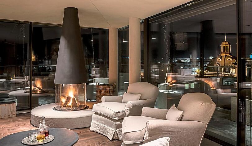 Nüchtern betrachtet ist auch diese Suite ein Hotelzimmer. Allerdings eins mit einer fast komplett umlaufenden Terrasse und einer Fläche von 350 Quadratmetern. Das kommt nicht ganz an das vielzitierte Fußballfeld (4.050 Quadratmeter) heran – aber welches Fußballfeld hat schon einen freistehenden Kamin? Eigene Küche und Bar? Einen Butler- und Chauffeurservice? Sauna und Dampfbad? Und ist gestaltet vom Innendesigner Alex Vervoordt? Die Antwort: keins.