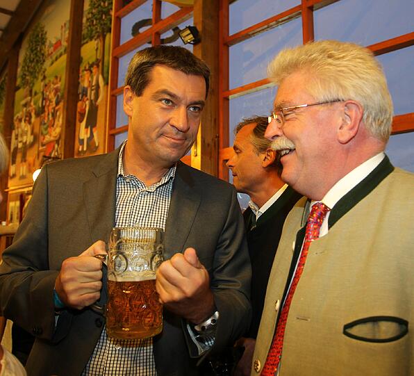 Das FDP-Wahldebakel war das Gesprächsthema des Abends. Eigentlich hätte auch Parteichef Philipp Rösler mit am Stammtisch sitzen sollen – doch der muss gerade die Parteikrise lösen und sagte ab. „Ich hab ihm schon eine SMS geschrieben, warum er heut nicht kommt”, witzelt Bayerns Umweltminister Markus Söder (CSU). „Das wird jetzt ganz bitter für die FDP.” Da erblickt er seinen Kabinettskollegen, Wirtschaftsminister Martin Zeil, und winkt erfreut: „Ich freu’ mich zurzeit über jeden gut gelaunten FDPler.” Zeil, der mit seiner Ehefrau Barbara Daumiller-Zeil gekommen ist, lässt sich die Wiesn-Gaudi auch nicht verderben. Er amüsiert sich über die AZ-Fotomontage mit Guido Westerwelle und den 1,8 Prozent-Schuhen: „Wir haben in Bayern auch mal 1,8 Prozent gehabt. Des war 1998. Und wo samma heut? In der Regierung.”