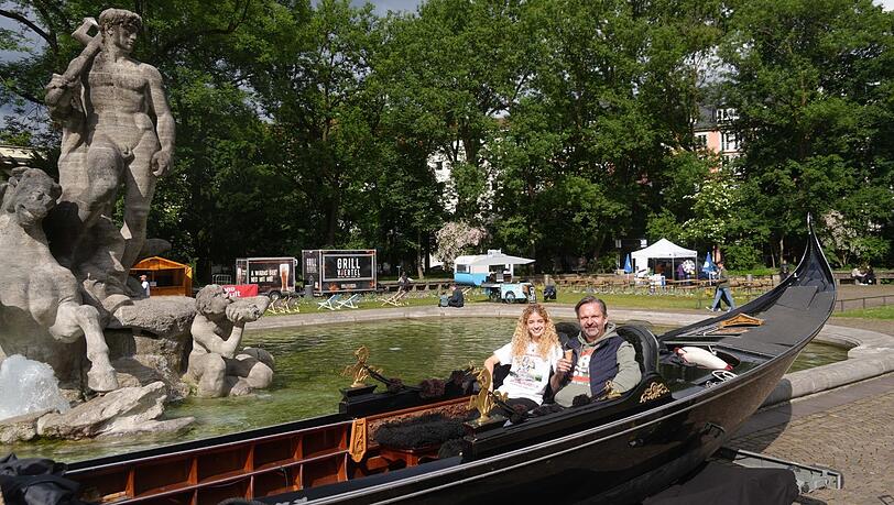 Zur Eröffnung kamen nicht nur Lokalpolitiker vorbei, sondern auch eine Gondel, die Maximilian Koch, der Gondoliere vom Nymphenburger Schlosspark, bis zum Neptunbrunnen gefahren hat. „Ich wollte zum Start einfach einen witzigen Hingucker haben“, sagt Chris Lehner. „Leider ist unser Brunnen zwar groß, aber nicht tief genug, als dass wir die Gondel richtig ins Wasser hätten setzen können.“