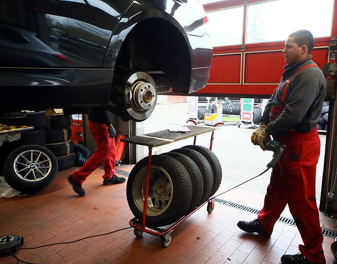 Außerdem: "Es ist bei uns immer ein Sicherheitscheck inbegriffen", sagt Daniel Markesic. Überprüft werden unter anderem die Lichter, Bremsen und Flüssigkeiten wie Motoröl und Frostschutzmittel. Markesic: "Unsere Kunden sollen ja gut durch den Winter kommen." Er hält es für sinnvoll, nach dem Reifenwechsel etwa 50 Kilometer zu fahren und dann noch einmal vorbeizukommen. Dann werden die Schrauben nachgezogen. Ansonsten kann es sein, dass sich doch mal eine löst. Dafür braucht es auch keinen Termin.