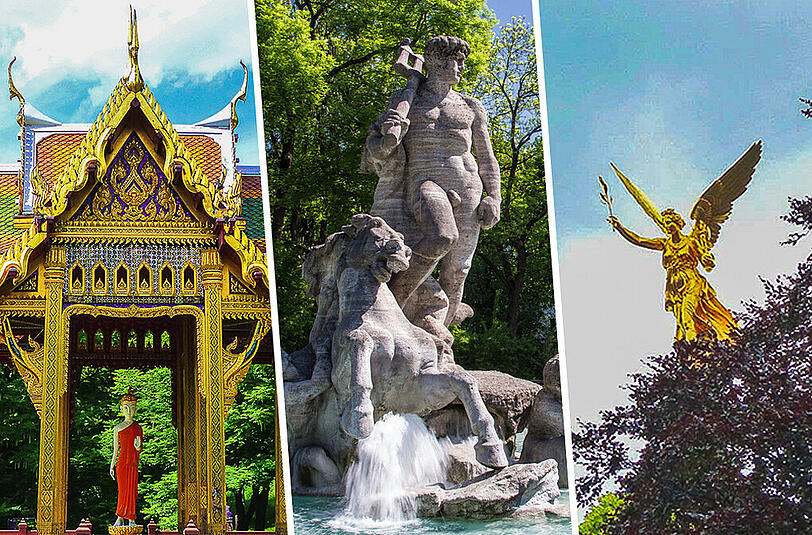 Asiatische Tempel und Salas – offene Pavillons – mitten in München? Im 60 Hektar großen Westpark taucht der Besucher in eine fernöstliche Welt ein und stillt sein Fernweh. Eine neun Meter hohe Buddha-Statue im Osten des Parks steht in einem Becken. Die Statue ist gedacht als „Zeichen für Toleranz und Aufgeschlossenheit gegenüber Andersdenkenden“. Ein thailändischer Bildhauer hat sie aus einem Ahorn-Baumstamm mitten im Marienhof ausgeschlagen.