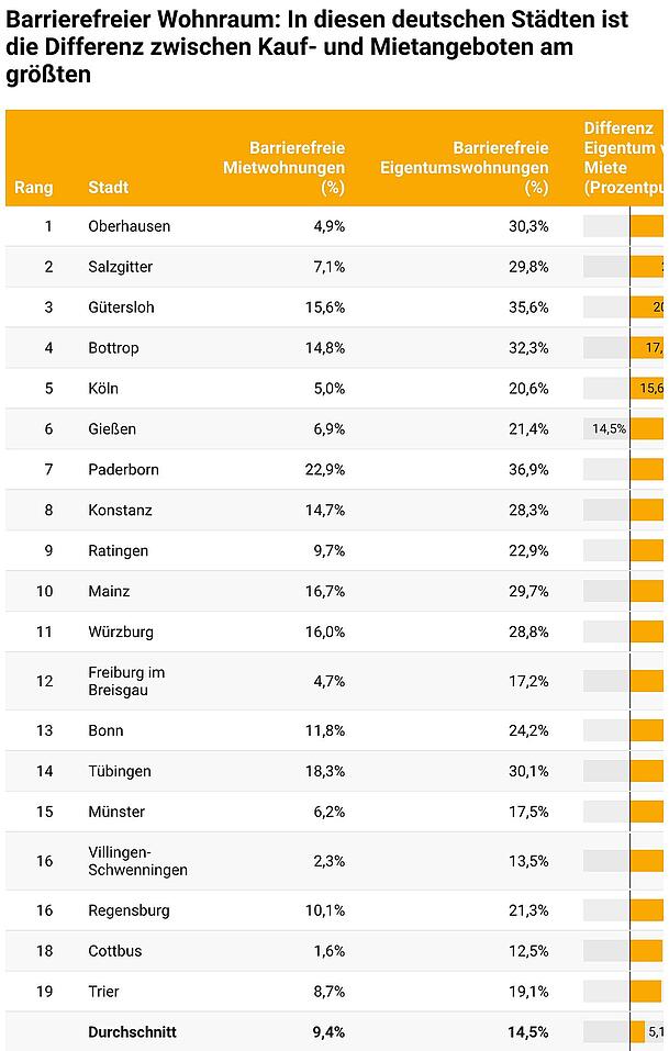 Deutlich schwieriger dürfte sich die Suche nach einer barrierefreien Wohnung hingegen in Gelsenkirchen, Chemnitz und Zwickau gestalten, wo jeweils nur 2,8 Prozent der angebotenen Wohnungen barrierefrei sind. Das ist der niedrigste Wert im bundesweiten Vergleich. Aber auch in Witten (3,3 Prozent), Kiel (3,6 Prozent) oder Recklinghausen (4,1 Prozent) ist das Angebot an Wohnraum mit stufenlosem Zugang besonders gering.