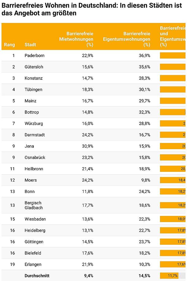 Im bundesweiten Schnitt sind 11,7 Prozent aller untersuchten Wohnungen barrierefrei, teilt "Eli die Fee" mit. Die besten Aussichten haben der Analyse zufolge Wohnungssuchende in Paderborn. Dort verfügen demnach 30,1 Prozent aller angebotenen Miet- und Kaufobjekte über einen stufenlosen Zugang. Auch Gütersloh (27,2 Prozent) und Konstanz (25,6 Prozent) erreichen Spitzenwerte.