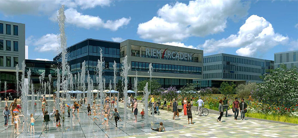 Erst 20 Jahre ist der Willy-Brandt-Platz vor den Riem Arcaden alt. Und doch ist er schon nicht mehr zeitgemäß. Hier gibt es kaum Grün, kaum Schatten, dafür eine sehr große graue, leere Fläche: Der Platz ist 120 Meter lang und 120 Meter breit. Macht: 14.000 Quadratmeter. "Das ist doppelt so groß wie die Rasenfläche der Allianz Arena", sagt Baureferentin Jeanne-Marie Ehbauer (Grüne).