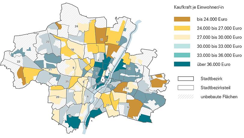 Und auch in den verschiedenen Stadtvierteln sitzt das Portemonnaie unterschiedlich locker. Die Spanne bewegt sich hier zwischen 20.000 und 40.000 Euro, die für Konsumausgaben zur Verfügung stehen.