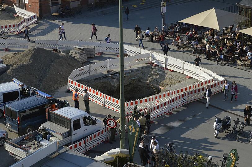 Am Mittwochabend dann wurde das Objekt nach und nach freigelegt. Laut dem Kampfmittelräumdienst handelt es sich dabei mit hoher Wahrscheinlichkeit um eine Bombe. Fundort ist in der Bäckerstraße, nur ein paar Meter vom Café Alex entfernt.