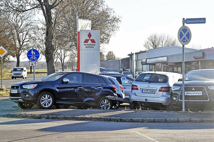 Weil sie beim Abbiegevorgang einen Schwindelanfall erlitt, kam sie von der Fahrbahn ab und steuerte frontal auf das Angebots-Auto zu. Der Mercedes überquerte den Fußweg und schoß mit solcher Wucht in die Gebrauchtwagen-Abteilung, dass der Schaden beträchtlich ist. Der "Space Star" wurde schwungvoll vom Podest gehoben und beschädigte gemeinsam mit seinem Widersacher die daneben abgestellten "Gelegenheiten".