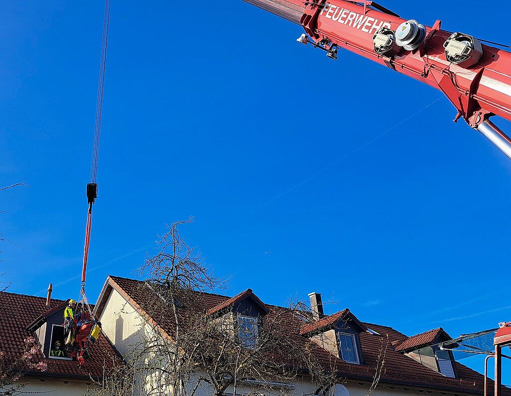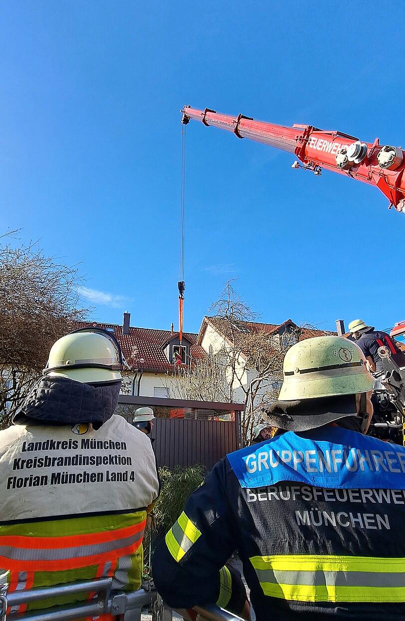 Weil wegen der nach hinten versetzten Lage des Hauses die Drehleiter der örtlichen Feuerwehr nicht ausreichte, forderte der Einsatzleiter einen Kranwagen und die Höhenrettungsgruppe der Feuerwehr München an.