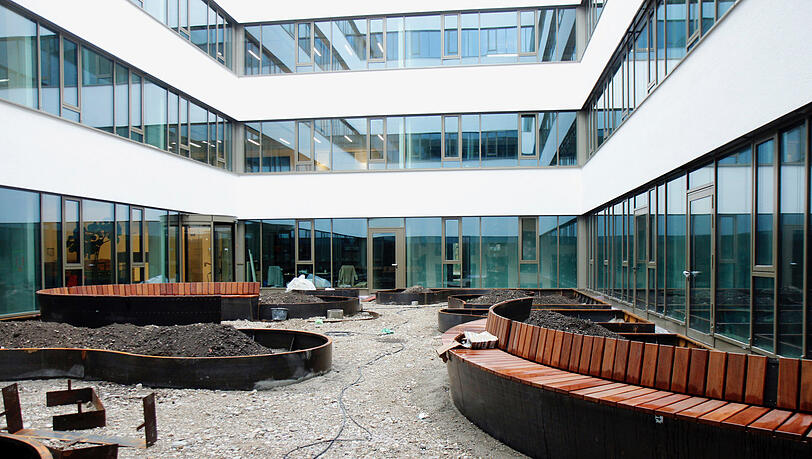 In zwei Innenhöfen wachsen bald hohe Bäume und natürlich soll es auch auf den Dachflächen und insgesamt 16 Terrassen blühen. Die Terrassen können künftig auch für Firmenfeiern genutzt werden.
