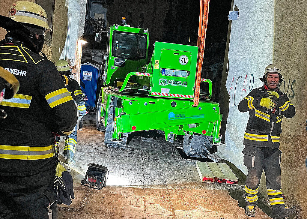 Die Feuerwehr hat einen Teleskoplader geborgen, der am Dienstag zwischen zwei Häusern in der Westendstraße steckengeblieben war. Der Boden hatte unter der Baumaschine nachgegeben, sodass das Fahrzeug mit einem Rad steckengeblieben war und nicht mehr weiterfahren konnte, wie es von der Feuerwehr hieß.