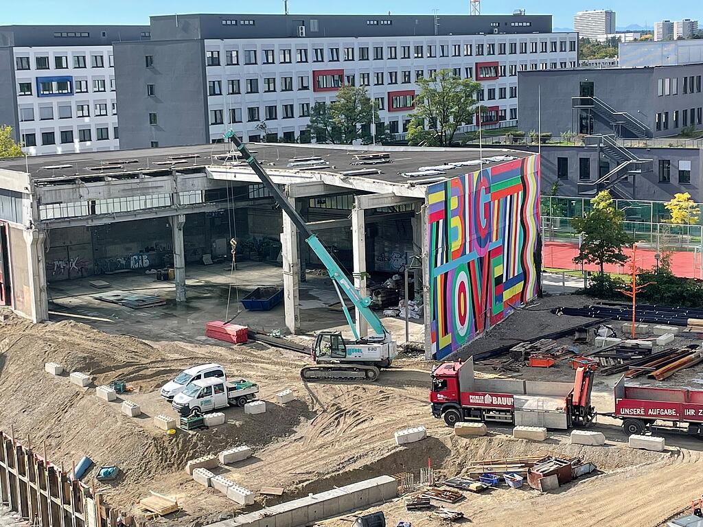 Eigentümer des 40.000-Quadratmeter-Geländes ist die Münchner Salvis Consulting. Sie lässt gerade eine große Baugrube für die Tiefgarage mit 1000 Plätzen ausheben. Bagger reißen jetzt die ausgediente Halle des früheren Betonwerks weg. Auch das bunte und bekannte Graffiti „Big Love“ muss weichen.