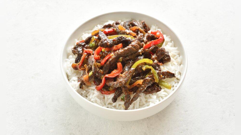 Den lockeren Basmatireis in eine Schüssel geben. Die knusprigen Rinderstreifen zusammen mit den bunten Paprikastreifen darauf anrichten, sodass die Farben gut zur Geltung kommen. Je nach Geschmack mit Frühlingszwiebelringen und geröstetem Sesam bestreuen.