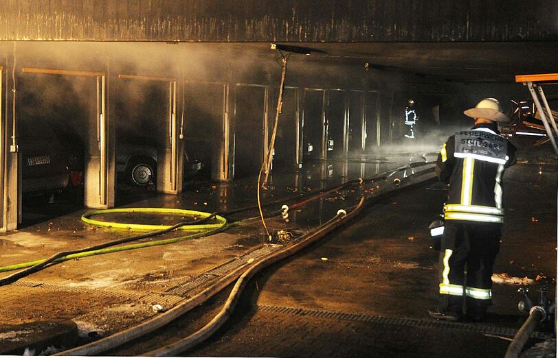 160 Einsatzkräfte kämpften bis in die frühen Morgenstunden gegen die Flammen. In der Garage wurden nach Angaben eines Feuerwehrsprechers mindestens zehn Fahrzeuge zerstört.