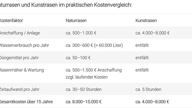 Über einen Zeitraum von 10 bis 15 Jahren entstehen für eine 200-Quadratmeter-Rasenfläche Gesamtkosten von rund 8.000 bis 15.000 Euro. Damit wird der Naturrasen zu einem lohnenden, aber herausfordernden Gartenprojekt. Für Gartenbesitzer, die Zeit und Kosten sparen möchten, rückt der Kunstrasen als Alternative immer stärker in den Fokus des Interesses.