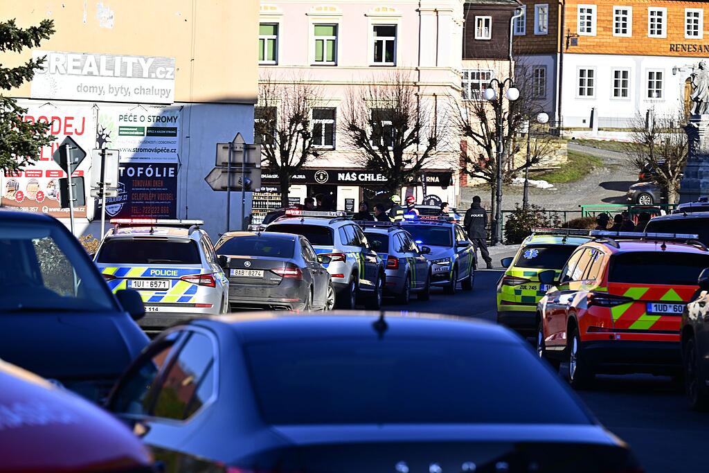 Die Polizei war am Montagvormittag mit allen verfügbaren Kräften am historischen Rathaus der Kleinstadt im Einsatz. Im ganzen Ort wurde Sirenenalarm ausgelöst, wie die Nachrichtenagentur CTK berichtete. Ein Polizei- und ein Rettungshubschrauber waren im Einsatz. Es drohe keine weitere Gefahr, hieß es nach einiger Zeit. Das Betreten des Gebäudes sei wieder sicher. Für besorgte Angehörige wurde eine Telefon-Hotline eingerichtet.