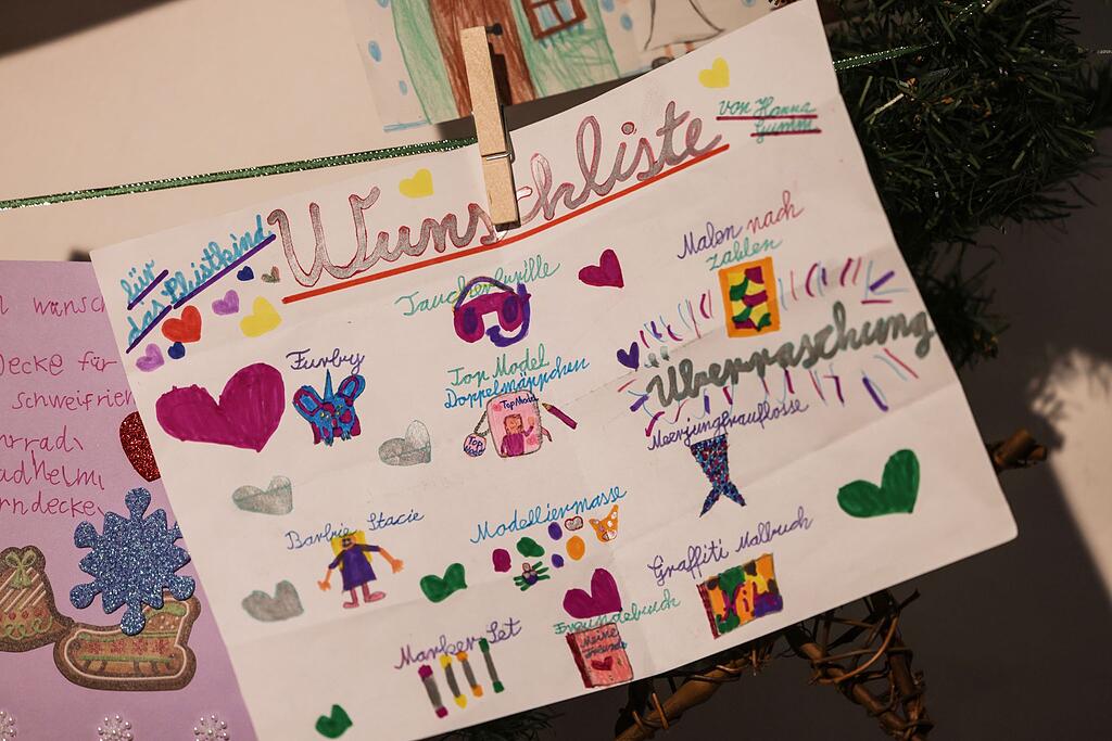 Hanna zum Beispiel hat ihre "Wunschliste" für das Christkind aufgemalt: Eine Taucherbrille findet sich dort ebenso wie Modelliermasse und eine Meerjungfrauenflosse. Mika wünscht sich Ohrlöcher und Elin "ein Pferd mit rosa Stulpen". Auf einem anderen Wunschzettel an das "liebe Kristkiend" stehen unter anderem eine Discokugel, ein Fernglas und Detektiv-Sachen.