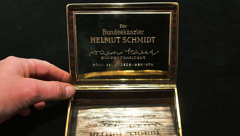 Ahlden - Zu Lebzeiten war Helmut Schmidt als starker Raucher bekannt - jetzt versteigert ein Auktionshaus in der Lüneburger Heide eine goldene Zigarettenschatulle des Ex-Kanzlers. Dabei handelt es sich um ein Geschenk des damaligen Bundespräsidenten Walter Scheel zu Schmidts 60. Geburtstag am 23. Dezember 1978, wie das Auktionshaus Schloss Ahlden mitteilte. Die Dose trägt den Bundesadler als Relief, die Inschriften "Einigkeit, Recht, Freiheit" sowie eine Widmung von Scheel. Geschätzt ist die Dose mit 26 500 Euro.