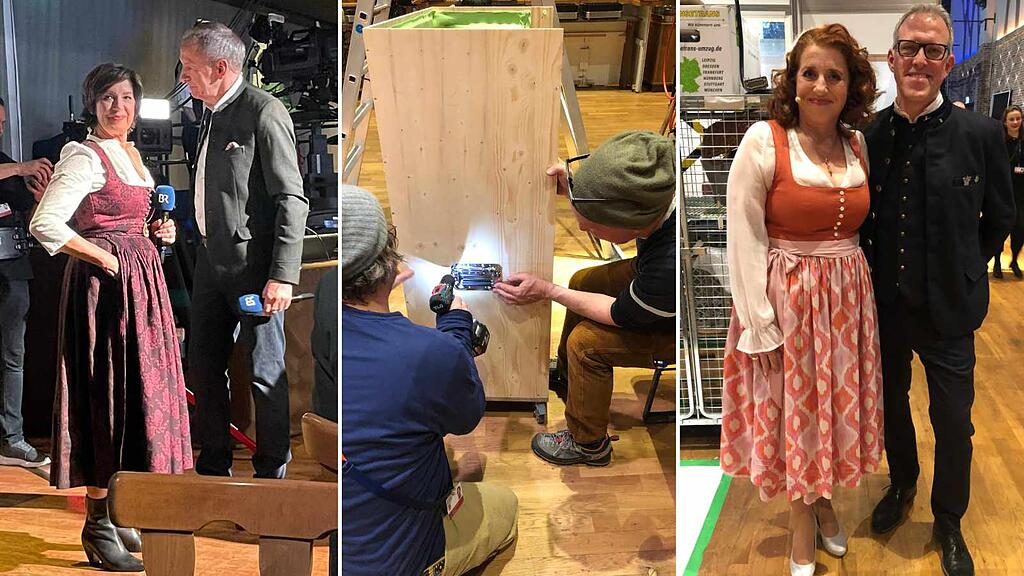 Kurz bevor der Nockherberg 2026 seine Tore öffnete, wurde im Backstage-Bereich noch fleißig gewerkelt. Bühnenarbeiter brachten die letzten Kulissenteile an und Lichttechniker richteten die Scheinwerfer final aus.