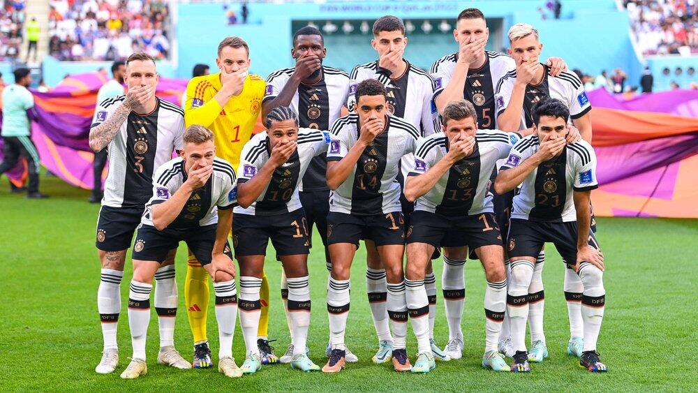 Die deutsche Nationalmannschaft hat bei ihrem ersten WM-Spiel gegen Japan am Mittwoch doch noch ein kleines Zeichen gesetzt: Auf dem Mannschaftsfoto, das die Fußballprofis vor dem Spiel zeigt, hält sich die gesamte Mannschaft die Hand vor den Mund. Die Geste ist klar: Sie wurden mundtot gemacht.
