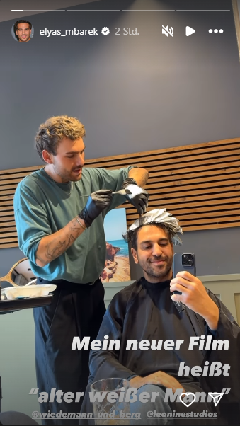 In seiner Instagram-Story teilt Elyas M'Barek kleine Einblicke aus seinem Leben. Lächelnd sieht man den Schauspieler in einem Friseursalon sitzen. Neben ihm arbeitet ein Mitarbeiter an seiner Frisur. Viel kann man nicht erkennen, da alles unter Alufolie versteckt ist – der 41-Jährige bekommt offenbar eine neue Farbe.