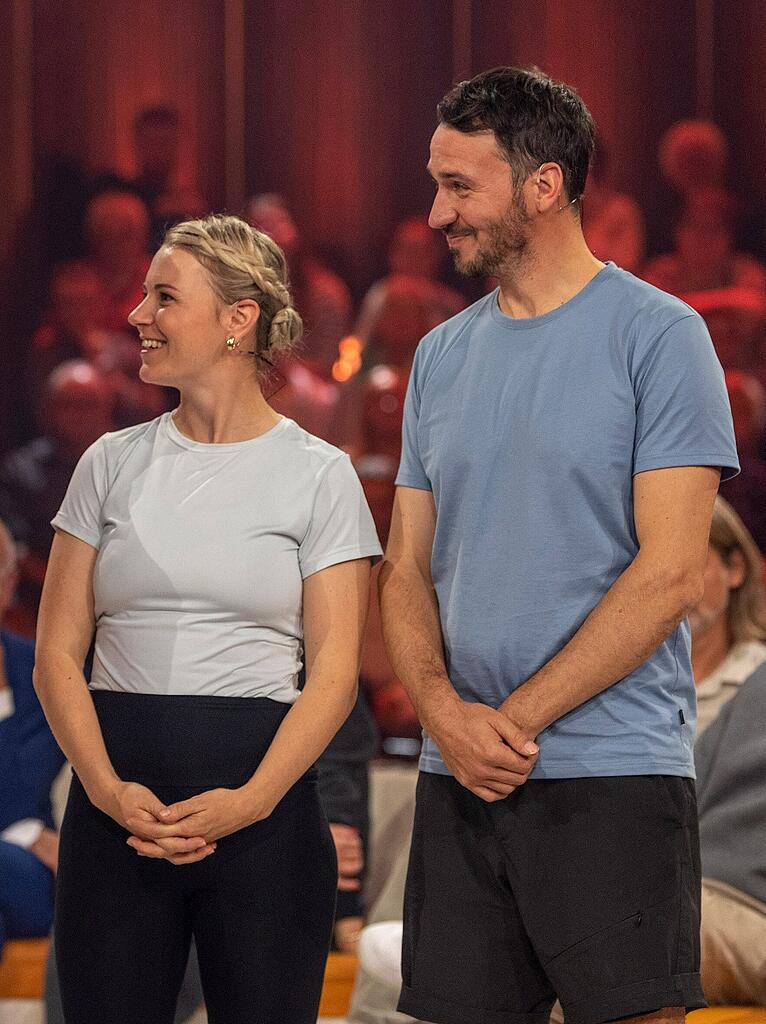 Die ehemaligen Ski-Profis Miriam (35) und Felix (41) Neureuther traten im "Ball-Stab-Wechsel-Duell" gegen Sarah und Lotte (beide 9) aus Mannheim an. Die beiden Mädchen behaupteten, in der Liegestützposition mehr Ball-Stab-Wechsel in 60 Sekunden zu schaffen als die Neureuthers. Eine anstrengende Aufgabe, wie sich schnell herausstellte. Vorab fragte Kai Pflaume die ehemaligen Ski-Profis schmunzelnd, ob das gemeinsame Training sich positiv auf die Ehe der beiden ausgewirkt habe.