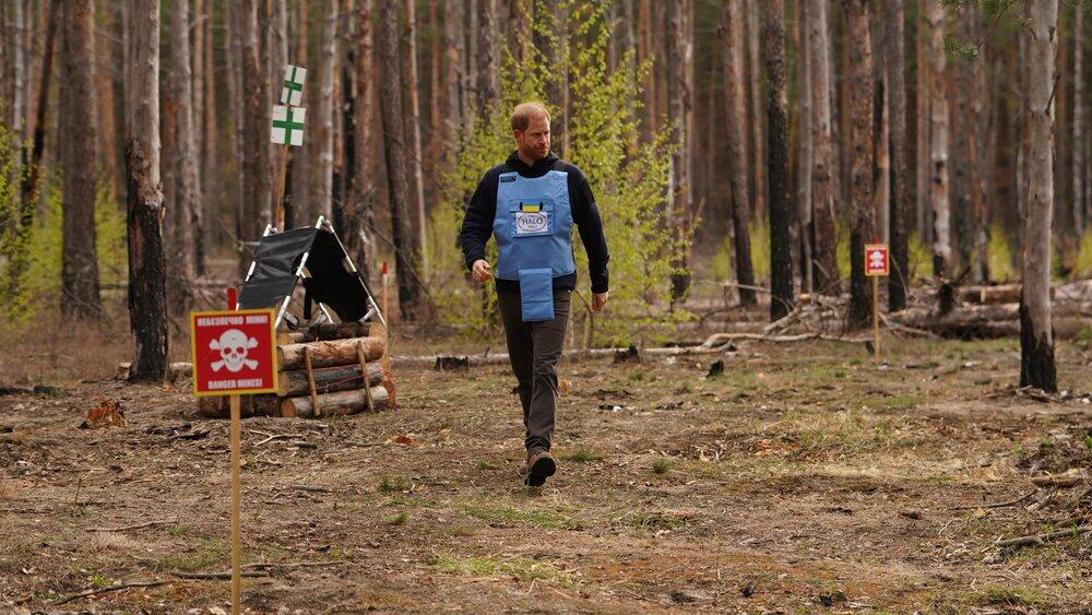 Anlass für das Gespräch war der überraschende Trip des Prinzen in das Kriegsland. Am Donnerstag war Harry in die Ukraine gereist, am Freitag besuchte er nahe der Stadt Butscha ein Räumkommando der Hilfsorganisation Halo Trust. Auf einem Übungsgelände ließ sich der Herzog die neuesten Methoden der digitalen Minenräumung zeigen. Bilder der Organisation zeigen ihn mit Pilotenhelm beim Steuern einer KI-gestützten Drohne, die Sprengkörper im Boden aufspürt. Anschließend bediente er einen Roboter, der zum Entfernen der Munition eingesetzt wird. Vor Ort würdigte er zudem die Opfer der russischen Besatzung von Butscha, die Anfang 2022 im Ort zahlreiche Zivilistinnen und Zivilisten das Leben kostete.