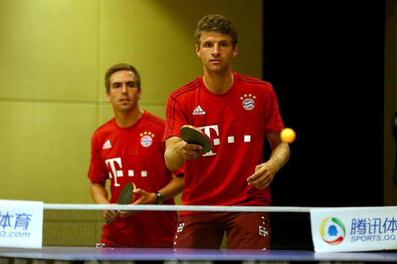 München - Bevor die Bayern-Stars den FC Valencia abfertigten, trafen sich Thomas Müller und Phlipp Lahm zu einer Tischtennispartie mit den Tischtennislegenden Wang Hao, Ding Ning und Liu Guoliang.