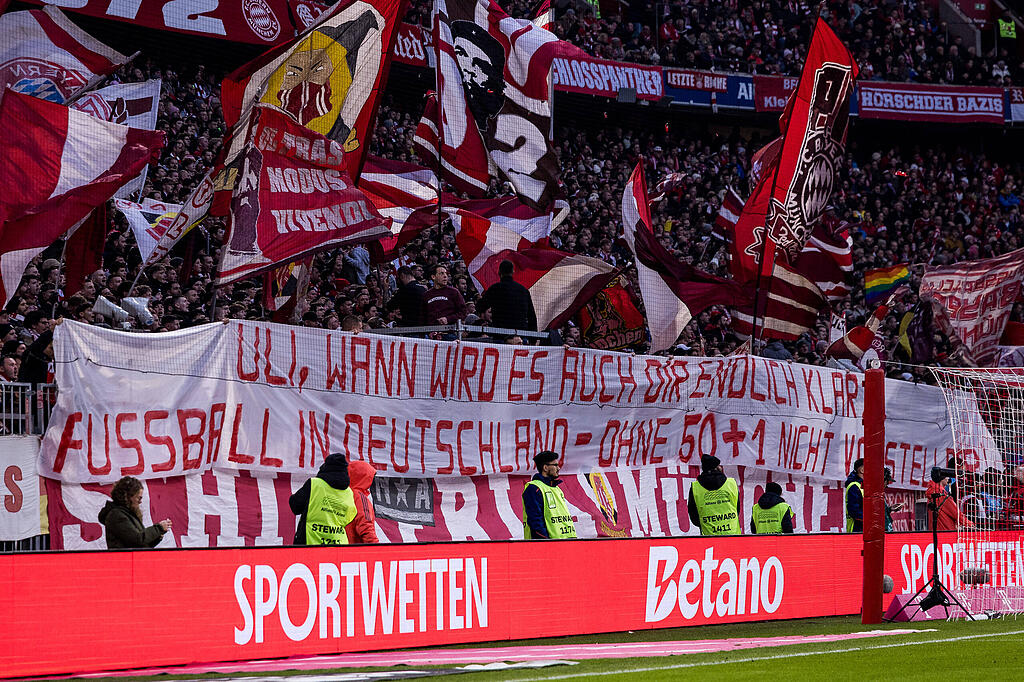 Deutliche Worte gegen Bayern-Ehrenpräsident Uli Hoeneß. Am Rande der Partie gegen den FC St. Pauli rollten die Ultras ein Banner aus. Darauf in fetten Lettern: "Uli, wann wird es auch dir endlich klar ... Fußball in Deutschland – ohne 50+1 nicht vorstellbar!"