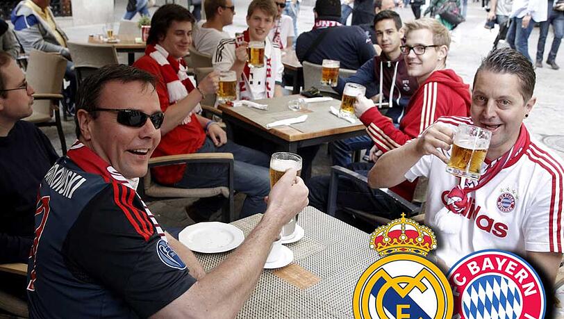 Ein Bier auf den FC Bayern! Die Fans, die dem FC Bayern nach Madrid nachgereist sind, heben schon die Gläser. Dabei treffen die Rekordmeister-Anhänger auch auf Fans von Real Madrid. Hier geht's zu den Bildern.