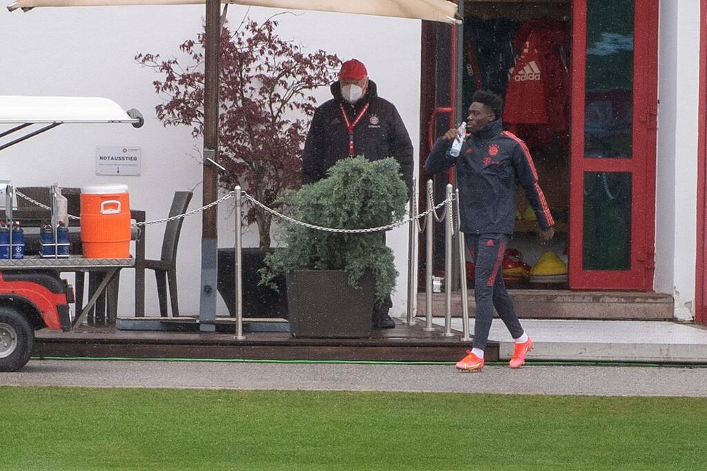 München - Die aktuelle Stimmung bei Alphonso Davies dürfte zum Wetter gepasst haben: Bei Nieselregen hat der verletzte Kanadier am Dienstag an der Säbener Straße vorbeigeschaut.
